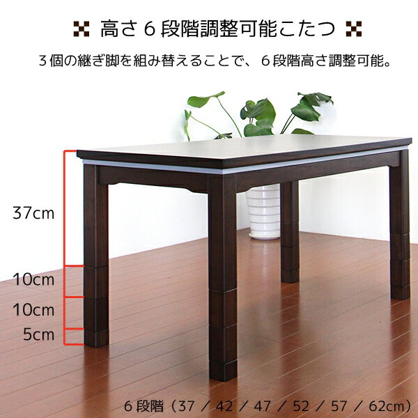 サイズ テーブル:幅120×奥行60×高さ37〜62cm 高さ6段階(37/42/47/52/57/62cm) 1P:幅59×奥行57〜105×高さ70〜98cm(座面高39/42/45) 材質 テーブル天板:ウォールナット突板 ウレタン樹脂塗装(UV) チェア:ラバーウッド ファブリック ラッカー塗装 カラー ダークブラウン 仕様 《こたつ》 ハロゲンヒーター 手元コントローラー 継脚:5cm×1・10cm×2 6段階高さ調節 コード収納ボックス付き マレーシア製 《1Pチェア》 背もたれ:レバー式8段階リクライニング 3段階座面高調節 下台カバー取り外し可 中国製 発送状態 お客様組立 送料 九州〜関東送料無料 備考 商品は、小売と併用しておりますので、常時在庫状況が変動いたします。